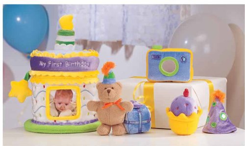 From Gund the My First Birthday 5-piece Playset comes in the shape of a birthday cake and has presents hidden inside Little ones can open it up to find a soft bear that plays Happy Birthday a plush camera with a mirror that squeaks a soft party hat and a present that crinkle and a cupcake th Read More..