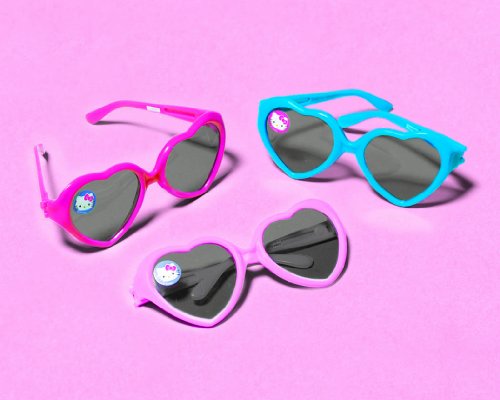 Pack of twelve child-sized heart-shaped sunglassesEach has a Hello-Kitty sticker on one lens Suggested for 3 years ageFour of each color pictured in this pack of twelve Pack of twelve child-sized heart-shaped sunglasses Each has a Hello-Kitty sticker on one lens Suggested for 3 years age Read More..